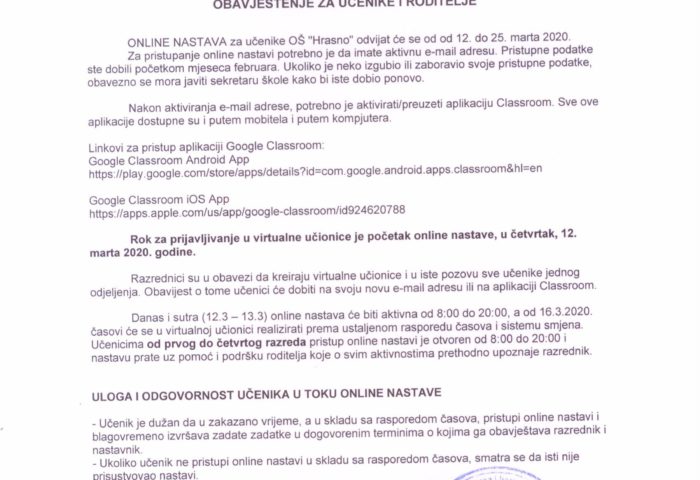 PLANIRANE PISMENE PROVJERE ZNANJA U RAZREDNOJ NASTAVI ZA II POLUGODIŠTE ŠKOLSKE 2019/ 20. GODINE Predmeti su u tabeli označeni skraćenicama BHS – bosanski, hrvatski, srpski jezik i književnost, MAT – matematika, MO-moja okolina; ENG – engleski jezik Klikom na link ispod možete otvoriti pdf dokument za pregled planiranih pismeni provjera od I do IV razreda. […]