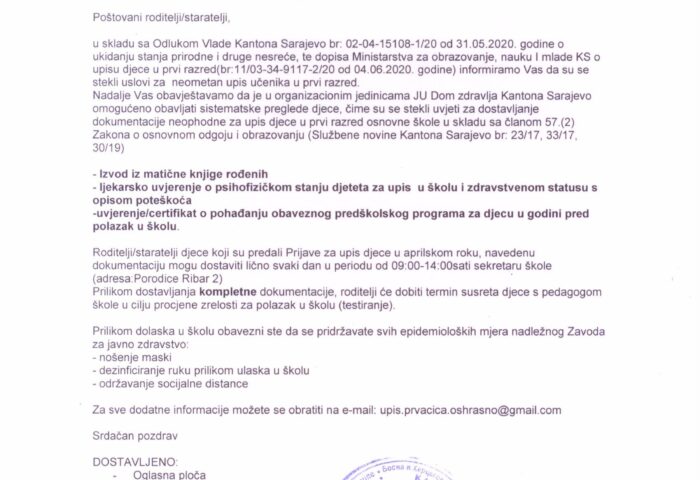 Poštovani roditelji, U prilogu se nalaze: Obrazac za Izjavu o pohađanju isključivo Online nastave Obrazac za pravdanje izostanaka Ukoliko želite da vaše dijete pohađa isključivo Online nastavu, molimo vas, da najkasnije do 01.02.2021. godine popunite priloženi obrazac i pošaljete mail razredniku_ci ili lično u prostorije Škole. Obrazac za pravdanje izostanaka koristite na osnovu ukazane potrebe. […]
