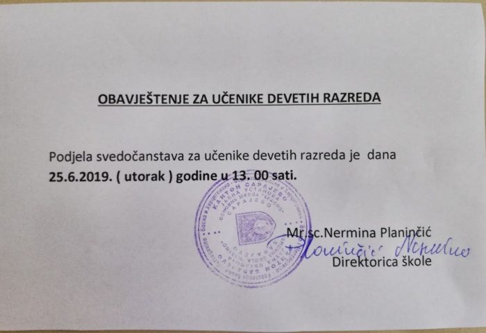 Obavještenje za učenike IX rezreda – termini instruktivne nastave
