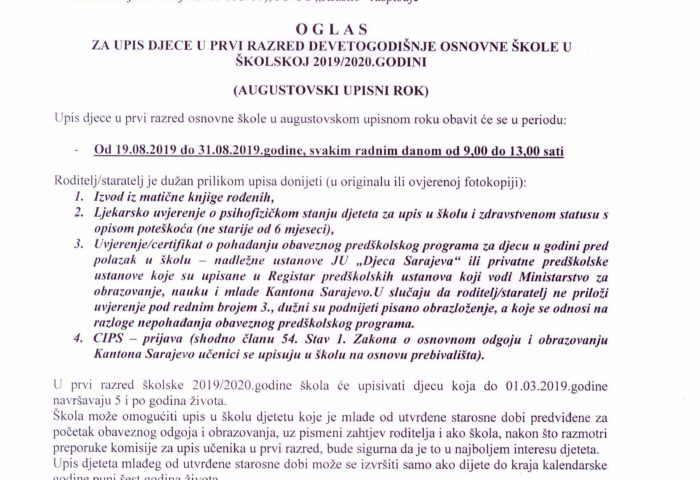 Na osnovu odredbi Zakona o javnim nabavkama Bosne i Hercegovine (Službeni glasnik BiH, broj: 39/14), člana 54. Uredbe o kontroli javnih nabavki u svim institucijama čiji je osnivač Kanton Sarajevo (Službene novine Kantona Sarajevo, broj: 27/19), člana 94. Zakona o osnovnom odgoju i obrazovanju (»Službene novine Kantona Sarajevo« br. 23/17, 33/17 i 30/19) i člana […]
