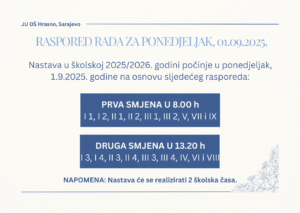 Raspored rada za ponedjeljak, 01.09.2025. godine